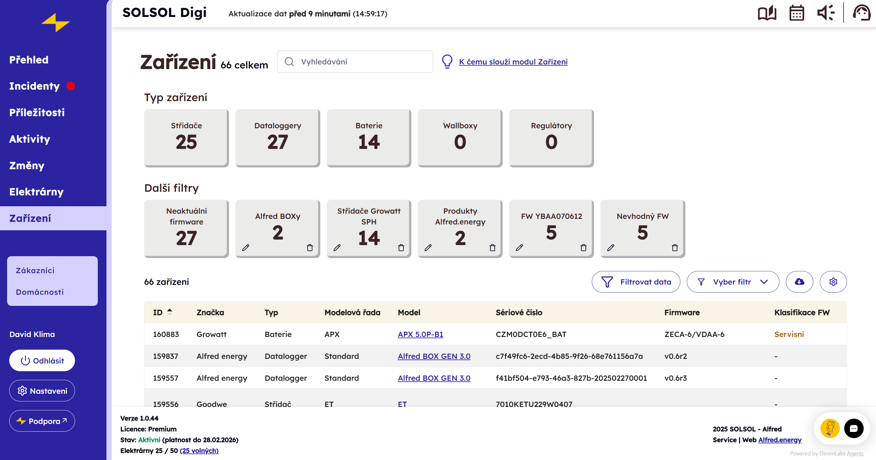 Pro instalační firmu funguje jako repozitář všech zařízení, která kdy připojila do systému Alfred.energy.