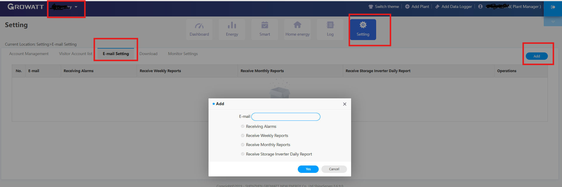 Dashboard elektrárny ---> Setting ---> E-mail Setting ---> Add