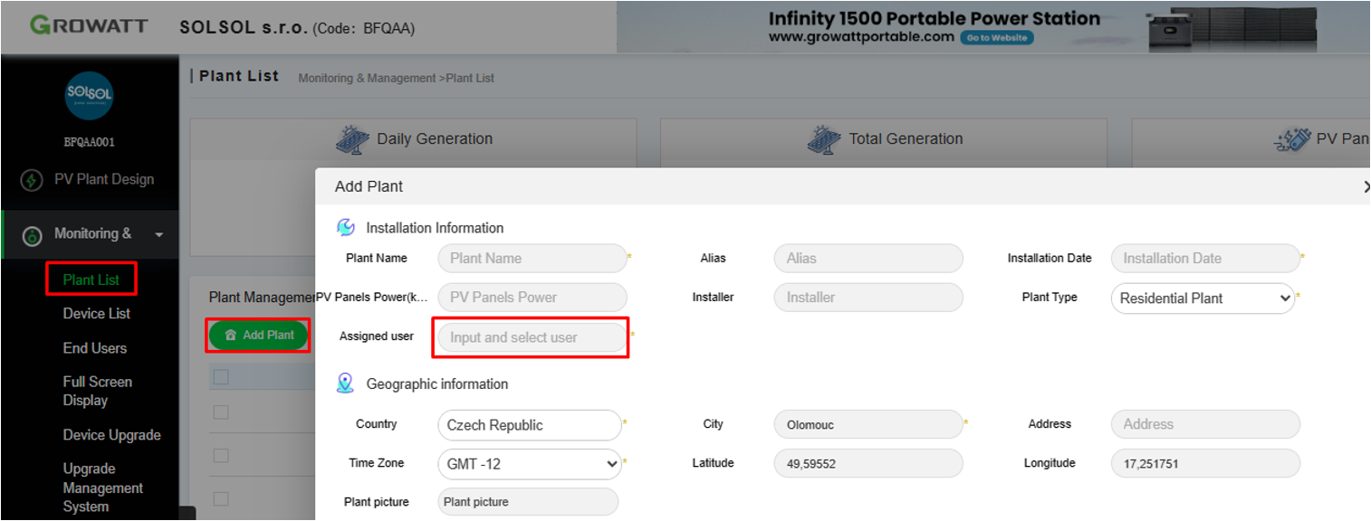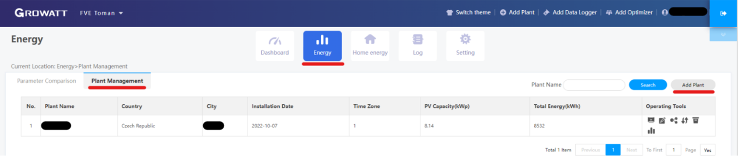 - Po přihlášení s účtem End user zvolte Energy > Plant Management > Add plant a vyplňte detaily elektrárny